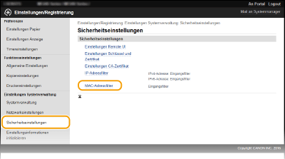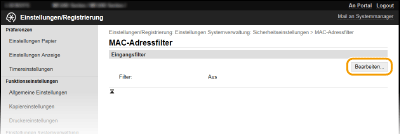Sie können die Einstellungen für die MAC-Adressfilterung über <Menü> aktivieren oder deaktivieren. MAC-Adressfilter