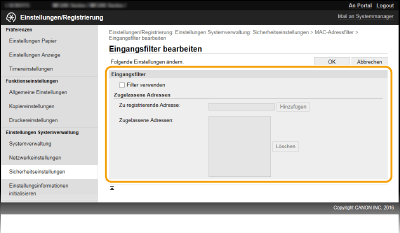 ![]() Prüfen auf Eingabefehler Wenn Sie falsche MAC-Adressen eingeben, können Sie eventuell nicht mehr mit Remote UI auf das Gerät zugreifen. In diesem Fall müssen Sie <MAC-Adressfilter> auf <Aus> setzen. MAC-Adressfilter