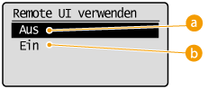 Remote UI ist nützlich, da Sie die Geräteeinstellungen über einen Web-Browser auf einem Computer festlegen können. Das Gerät muss mit einem Computer im Netzwerk verbunden sein, damit Sie Remote UI verwenden können. Wenn Sie Remote UI nicht benötigen, können Sie Remote UI deaktivieren und so das Risiko verringern, dass ein böswilliger Dritter das Gerät über das Netzwerk fernsteuert.