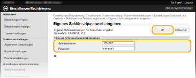 Geben Sie den Namen des Schlüsselpaars und das Passwort ein, und klicken Sie dann auf [OK].