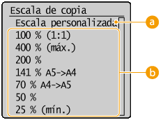 Podrá ampliar o reducir las copias utilizando una escala de copia preestablecida, como por ejemplo <A5->A4>, o estableciendo una escala de copia personalizada en incrementos del 1%.