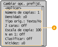 . Si cambia esta configuración predeterminada para adaptarla a las operaciones que realiza con mayor frecuencia, puede eliminar la necesidad de realizar la misma configuración cada vez que realice copias.