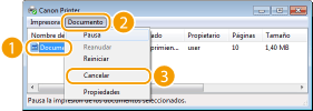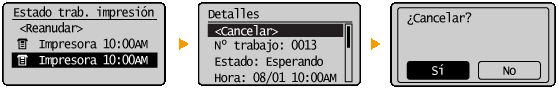 Cancelación desde la IU remotaPodrá cancelar la impresión desde la página [Estado de trabajos] de la IU remota: Comprobación del estado actual de los documentos de impresión