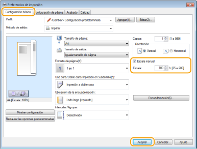 Pestaña [Configuración básica] Seleccione la casilla de verificación [Escala manual] Introduzca la escala de impresión en [Escala] [Aceptar]