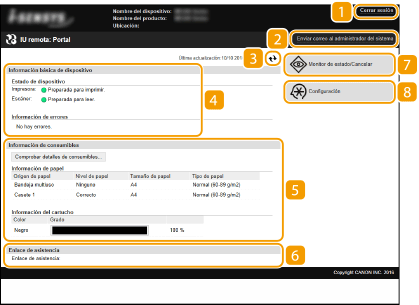 Muestra el enlace de asistencia especificado en [Información del dispositivo] debajo de [Gestión del sistema].