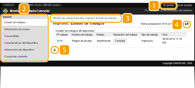 Muestra el estado de los documentos de impresión actuales y el historial de documentos de impresión y copia. También podrá comprobar el estado del equipo.