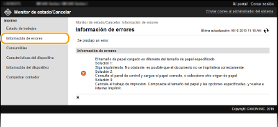 Cuando se produce un error, esta página aparecerá haciendo clic en el mensaje que aparece debajo de [Información de errores] en la página del portal (página principal).