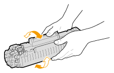 Schud de tonercartridge 5 of 6 keer (zie onderstaande afbeelding) om de toner binnenin de cartridge gelijkmatig te verdelen.