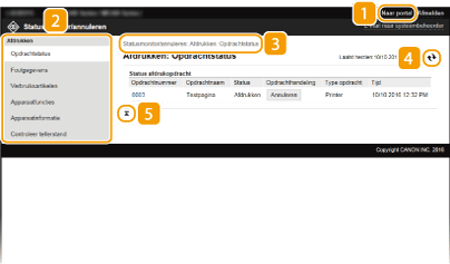 Hiermee geeft u de status weer van de huidige afdruktaken en de geschiedenis van afdruk- en kopieertaken. U kunt ook de status van de machine controleren.
