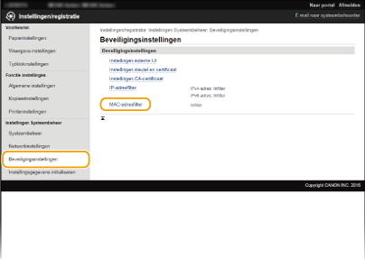 ![]() Controleer op invoerfouten Als u MAC-adressen verkeerd invoert, kunt u het apparaat mogelijk niet bereiken vanuit de UI op afstand. Om dat op te lossen, moet u <MAC-adresfilter> instellen op <Uit>. MAC-adresfilter