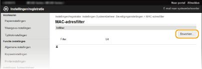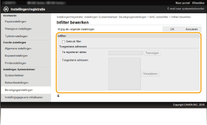 U kunt de instellingen voor MAC-adresfilters in- of uitschakelen vanaf <Menu>. MAC-adresfilter