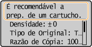 A máquina apresenta uma mensagem quando uma cartridge de toner estiver quase a acabar. Tenha em atenção que a qualidade de impressão ficará fraca se continuar a imprimir sem tomar qualquer medida. Pode verificar o nível restante da cartridge de toner no visor.