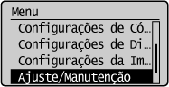 Todas as definições relativas a ajuste e manutenção são apresentadas com breves descrições. As predefinições estão assinaladas com uma cruz (