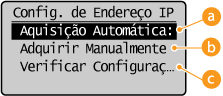 ![]() Se aparecer <Ativado>, selecione <Aquisição Automática> e defina <Selecionar Protocolo> e <IP Automático> como <Desativado>.
