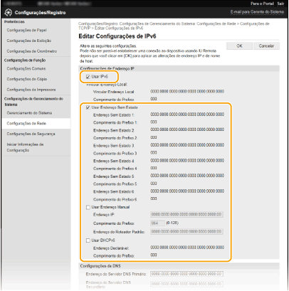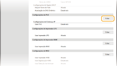 Os endereços IPv6 da máquina podem ser configurados através da UI Remota. Antes de definir endereços IPv6, verifique as definições de endereço IPv4 (Ver as definições de IPv4). É necessário configurar as definições corretas de IPv4 para poder utilizar endereços IPv6. Tenha em atenção que a função de digitalização que utiliza o controlador de scanner ou o MF Scan Utility (Utilitário de digitalização MF) não está disponível no ambiente IPv6. A máquina pode utilizar até um máximo de nove dos seguintes endereços IPv6: