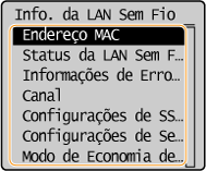 <Status da LAN Sem Fio> e <Informações de Erro Recentes> podem ser vistos a partir de