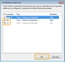 ![]() Selecione controladores adicionais de entre as opções que se seguem, de acordo com o sistema operativo do servidor de impressão.