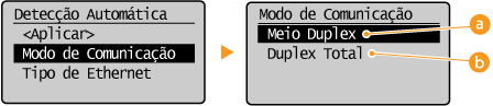 selecione <Meio Duplex> ou <Duplex Total> .![]() <Meio Duplex>Envia e recebe dados de comunicação alternadamente. Selecione esta opção quando a máquina estiver ligada a um dispositivo de rede que utilize semiduplex.