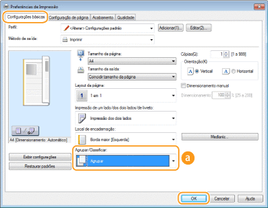 Quando imprimir cópias de documentos com várias páginas, selecione [Agrupar] para imprimir conjuntos completos pela ordem sequencial das páginas. Esta função é útil para preparar material escrito para distribuição em reuniões ou apresentações.