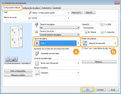 Pode imprimir várias páginas numa só folha. Por exemplo, pode imprimir quatro ou nove páginas numa só folha utilizando [4 em 1] ou [9 em 1]. Utilize esta função se pretender poupar papel ou ver os documentos como miniaturas.
