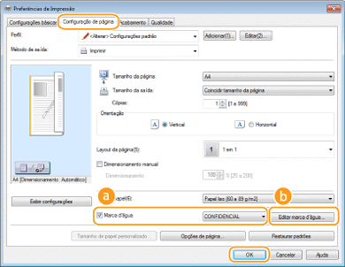 Selecione a caixa de verificação [Marca d'água] para ver a lista de marcas de água incluídas na lista pendente. Selecione uma marca de água no menu.