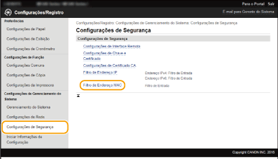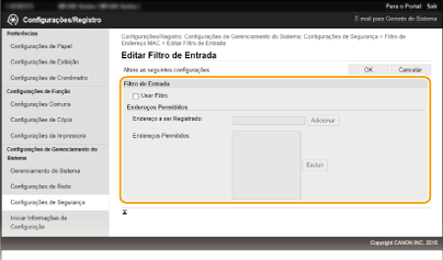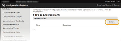 ![]() Verificar se existem erros de introdução Se os endereços MAC não forem introduzidos corretamente, poderá não conseguir aceder à máquina a partir da UI Remota; nesse caso, será necessário definir <Filtro de Endereço MAC> como <Desativado>. Filtro de Endereço MAC