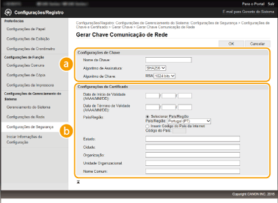É possível criar um par de chaves com a máquina quando tal for necessário para comunicação codificada através de TLS (Transport Layer Security). Pode utilizar o protocolo TLS quando pretender aceder à máquina através da UI Remota. É possível criar até cinco pares de chaves (incluindo os pares pré-instalados) para a máquina. São utilizados certificados autoassinados com pares de chaves criados em "Comunicação de Rede". Com "Chave e Solicitação de Assinatura de Certificado (CSR)", pode pedir um certificado digital emitido por uma AC para o par de chaves criado pela máquina.