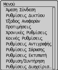 , θα εμφανιστεί η οθόνη <Μενού>. Στην οθόνη αυτή, μπορείτε να ξεκινήσετε τον καθορισμό των γενικών ρυθμίσεων του μηχανήματος, όπως <Προτιμήσεις> ή <Χρονικές Ρυθμίσεις>, καθώς και πολλές ρυθμίσεις για κάθε λειτουργία, όπως αντιγραφή και σάρωση.