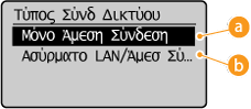 Αυτόματη έξοδος από τη λειτουργία Άμεσης ΣύνδεσηςΜπορείτε, επίσης, να ρυθμίσετε τη συσκευή να εξέρχεται αυτόματα από τη λειτουργία Άμεσης Σύνδεσης μόλις περάσει ένα συγκεκριμένο χρονικό διάστημα αφού η συσκευή έχει εισέλθει στη λειτουργία Άμεσης Σύνδεσης. Εάν η ρύθμιση <Ασύρματο LAN/Άμεσ Σύνδ (Αυτ. Εναλλαγή)> έχει καθοριστεί ως τρόπος σύνδεσης στην Άμεση Σύνδεση, τότε το μηχάνημα θα συνδεθεί σε ασύρματο LAN αυτόματα μετά την έξοδο από την Άμεση Σύνδεση.