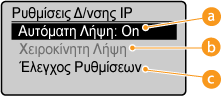![]() Εάν εμφανιστεί το μήνυμα <On>, πατήστε <Αυτόματη Λήψη> και ορίστε τις ρυθμίσεις <Επιλογή Πρωτοκόλλου> και <Αυτ. IP> σε <Off>.
