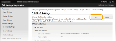 Οι διευθύνσεις IPv6 του μηχανήματος μπορούν να διαμορφωθούν μέσω του Remote UI (Απομακρυσμένο περιβάλλον εργασίας). Προτού ρυθμίσετε τις διευθύνσεις IPv6, ελέγξτε τις ρυθμίσεις διευθύνσεων IPv4 (Προβολή ρυθμίσεων IPv4). Για να χρησιμοποιήσετε τις διευθύνσεις IPv6, πρέπει να ορίσετε τις σωστές διευθύνσεις IPv4. Έχετε υπόψη ότι η λειτουργία σάρωσης που χρησιμοποιεί το πρόγραμμα οδήγησης σαρωτή ή το MF Scan Utility (Βοηθητικό πρόγραμμα σάρωσης MF) δεν είναι διαθέσιμη σε περιβάλλον IPv6. Το μηχάνημα μπορεί να χρησιμοποιήσει έως εννέα από τις παρακάτω διευθύνσεις IPv6: