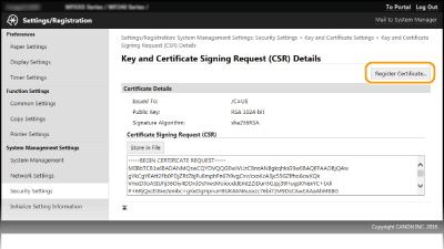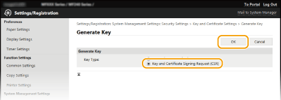 Μπορείτε να δημιουργήσετε ένα ζεύγος κλειδιών από τη συσκευή, όταν είναι απαραίτητο για την κρυπτογραφημένη επικοινωνία μέσω TLS (ασφάλεια επιπέδου μεταφοράς). Μπορείτε να χρησιμοποιήσετε το TLS όταν έχετε πρόσβαση στη συσκευή μέσω του Remote UI (Απομακρυσμένο περιβάλλον εργασίας). Έως πέντε ζεύγη κλειδιών (συμπεριλαμβανομένων των προεγκατεστημένων ζευγών) μπορούν να δημιουργηθούν στη συσκευή. Τα αυτόματα υπογεγραμμένα πιστοποιητικά χρησιμοποιούνται με τα ζεύγη κλειδιών που δημιουργούνται με την επιλογή «Network Communication». Με το «Key and Certificate Signing Request (CSR)», μπορείτε να ζητήσετε την έκδοση ενός ψηφιακού πιστοποιητικού από μια αρχή έκδοσης πιστοποιητικών (CA) για το ζεύγος κλειδιών που έχει δημιουργήσει η συσκευή.