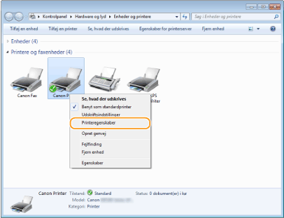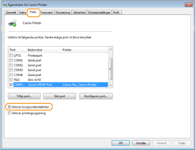 Hvis du bruger en netværksforbindelse og har ændret maskinens IP-adresseHvis [Beskrivelse] for den valgte port er [Canon MFNP-port], og maskinen og computeren er på det samme underne, så fastholdes forbindelsen. Du behøver ikke tilføje en ny port. Hvis det er [TCP/IP-standardport], skal du tilføje en ny port. Konfiguration af printerport