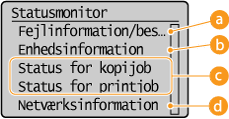 , vises en skærm, der giver dig mulighed for at kontrollere statussen for de dokumenter, der udskrives eller kopierres, samt statussen for maskinen (mængde tilbage i tonerpatronen osv.) og netværksindstillinger som f.eks. maskinens IP-adresse.
