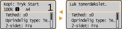 Meddelelser vises øverst på skærmen i situationer som f.eks. når toneren er ved at være opbrugt, eller når et dæksel er åbent. Displayet skifter mellem at vise den normale skærm og meddelelsen.