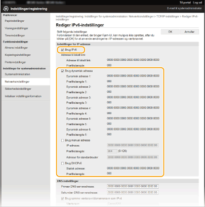 IPv6-adresserne på maskinen kan konfigureres via Brugerinterface til fjernbetjening. Før du indstiller IPv6-adresserne, skal du kontrollere IPv4-adresseindstillingerne (Visning af IPv4-indstillinger). Du skal angive de korrekte IPv4-indstillinger for at bruge IPv6-adresser. Bemærk, at scanningsfunktionen, der anvender scannerdriveren eller MF Scan Utility ikke er tilgængelig i et IPv6-miljø. Maskinen kan anvende op til ni af følgende IPv6-adresser: