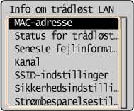 <Status for trådløst LAN> og <Seneste fejlinformation> kan vises fra