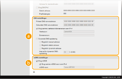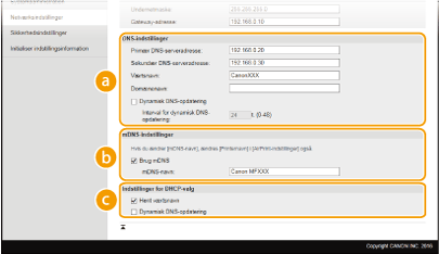 Marker afkrydsningsfeltet for dynamisk at opdatere DNS-poster, hver gang maskinens IP-adresse ændres. Når du angiver intervallet mellem opdateringer, skal du angive tiden i timer i tekstfeltet [Interval for dynamisk DNS-opdatering]. [mDNS-indstillinger][Brug mDNS]