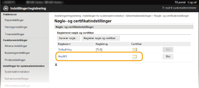Det er ikke muligt at slette et nøglepar, hvis det aktuelt bruges til et formål, f.eks. når "[TLS]" eller "[IEEE 802.1X]" vises under [Nøglebrug]. I dette tilfælde skal du deaktivere funktionen eller erstatte nøgleparret, før du sletter det.