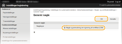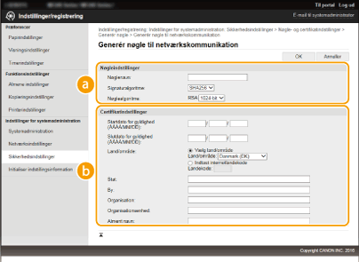 Der kan genereres et nøglepar med maskinen, når det er nødvendigt til krypteret kommunikation via TLS (Transport Layer Security). Du kan bruge TLS, når du har adgang til maskinen via Brugerinterface til fjernbetjening. Der kan genereres op til fem nøglepar (inklusive de par, der er genereret på forhånd) til maskinen. Selvunderskrevne certifikater bruges sammen med nøglepar, der er genereret i "Netværkskommunikation". Med "Nøgle og anmodning om signering af certifikat (CSR)" kan du ansøge om et CA-udstedt digitalt certifikat til det nøglepar, der er genereret af maskinen.