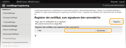 Du kan ikke bruge det nøglepar, der er genereret af CSR (Certificate Signing Request), før certifikatet er registreret. Når certificeringsmyndigheden har udstedt det digitale certifikat, skal du registrere det ved hjælp af procedure herunder.
