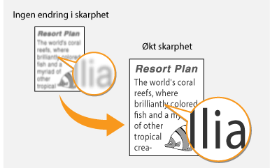 Du kan justere skarpheten for det kopierte bildet. Øk skarpheten for å få skarpere tekst og linjer, eller reduser skarpheten for å forbedre utseendet til fotoer fra ukeblader.