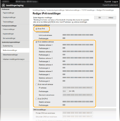IPv6-adressene for maskinen kan konfigureres via Fjernkontroll. Før du angir IPv6-adresser, må du kontrollere IPv4-adresseinnstillingene (Vise IPv4-innstillinger). Du må angi riktige IPv4-innstillinger for å kunne bruke IPv6-adresser. Legg merke til at skannefunksjonen som bruker skannerdriveren eller MF Scan Utility, ikke er tilgjengelig i et IPv6-miljø. Maskinen kan bruke opptil ni av IPv6-adressene nedenfor: