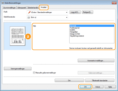 Velg et alternativ som passer dokumenttypen eller formålet med utskriften. For eksempel, velg [Generelt] for generelt bruk, eller velg [Fotografier] når du vil skrive ut fotobilder i optimal utskriftskvalitet.