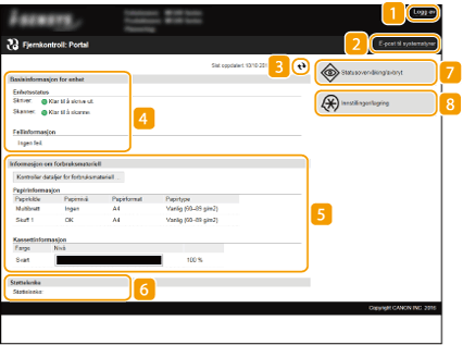 Viser gjeldende status for maskinen og feilinformasjon. Hvis det har oppstått en feil, vises en kobling til en side med feilinformasjon.