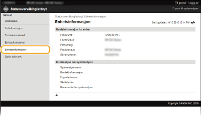 Informasjon om maskinen og systemadministrator vises. Denne informasjonen er angitt under [Systemstyring] på siden [Innstillinger/lagring].