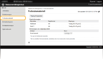 Papirstørrelse og -type for papirkilden, modellnummer for tonerkassett, osv. viser. Du kan også klikke på [Kontroller detaljer for forbruksmateriell] i