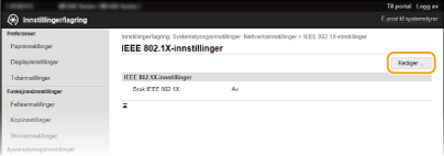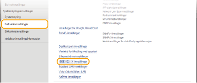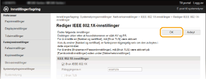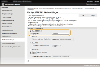 Bruke betjeningspaneletDu kan også aktivere eller deaktivere IEEE 802.1X-godkjenning fra <Meny>. IEEE 802.1X-innstillinger