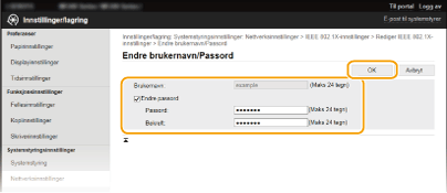 Hvis du vil angi eller endre passordet, krysser du av i boksen og taster inn opptil 24 alfanumeriske tegn for det nye passordet både i tekstboksen [Passord] og i tekstboksen [Bekreft]. |