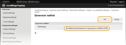 Et nøkkelpar kan genereres med maskinen når det er nødvendig for kryptert kommunikasjon via TLS (Transport Layer Security). Du kan bruke TLS når du har tilgang til maskinen via Fjernkontroll. Opptil fem nøkkelpar (inkludert de forhåndsinstallerte parene) kan genereres på maskinen. Selvsignerte sertifikater brukes med nøkkelpar som er generert i "Nettverkskommunikasjon". Med en "Nøkkel og forespørsel om signering av sertifikat (CSR)", kan du søke om et CA-utstedt digitalt sertifikat for nøkkelparet som ble generert av maskinen.